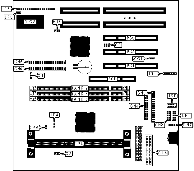 32-bit PCI slots (3), floppy drive interface, green PC connector, IDE interfaces (2), parallel port, PS/2 mouse interface, serial ports (2), IR connector, USB connector, ATX power connector, AGP slot, SB-link connector, wake on LAN connector