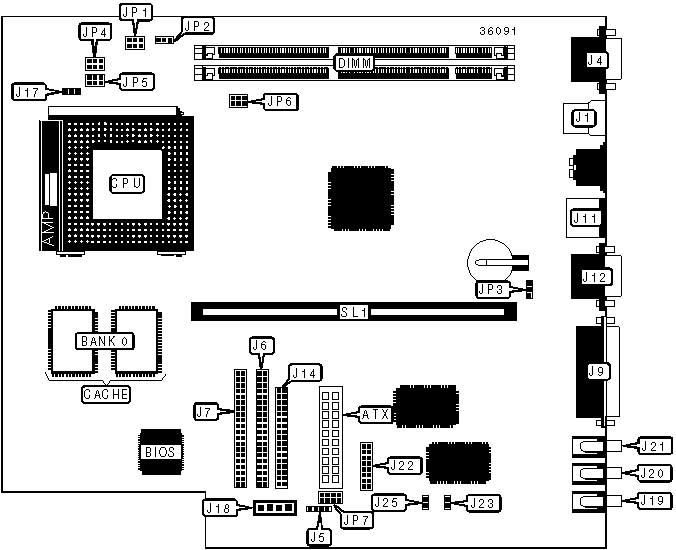 Floppy drive interface, game interface, IDE interfaces (2), parallel port, PS/2 mouse port, serial ports (2), VGA port, riser slot, USB connector, ATX power connector, line in, line out, microphone in, audio in – CD-ROM |