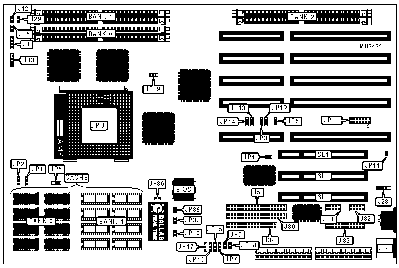 32-bit PCI slots (3), floppy drive interface, IDE interface (2), parallel port, PS/2 mouse port, serial ports (2)