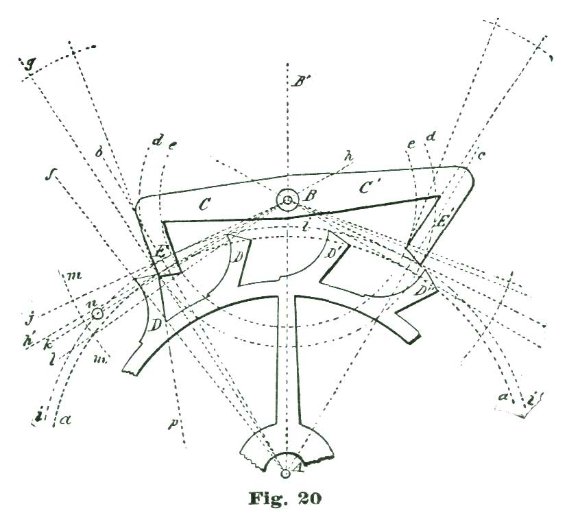 In the drawing shown at Fig. 20 the radius of this curve was obtained by taking eleven and a half degrees from the degree arc of 5" radius in the dividers, and setting one leg at the intersection of the radial line A f with the arc i, and placing the other on the line i, and allowing the point so established to serve as a center, the arc was swept for the back of the tooth, the small circle at n denoting one of the centers just described. The length for the face of the tooth was obtained by taking eleven degrees from the degree arc just referred to and laying that space off on the line p, which defined the face of the tooth. The line B k is laid off one and a half degrees below B h on the arc m. The extent of this arc on the arc d defines the locking face of the entrance pallet. We set off four degrees on the arc m below the line B k, and through the point so established draw the line B l. We draw a line from the intersection of the line A g with the line c h to the intersection of the arc e with the line c l, and define the impulse face of the entrance pallet.