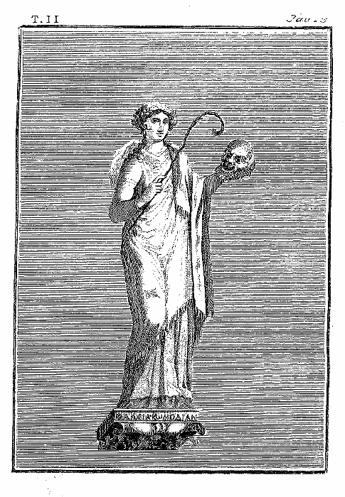 La seconde figure, posant sur un ornement, qui paraît une partie de chapiteau ionique dessiné sur le côté, et soutenant un fût d'une forme capricieuse, est elle-même un ornement d'architecture. C'est un Atlas, suivant la dénomination des Grecs; un Télamon, suivant celle des Latins. Les figures de femme ainsi employées prennent le nom de Cariatides (vide VITR. IV, 10). La nudité de cette figure, la couronne, le rameau, le disque, la draperie jetée sur le bras, conviennent particulièrement un Camille ou Ministre des sacrifices. Les attributs des Télamons ou des Cariatides varient selon le caprice du décorateur, ou suivant le genre d'édifice auquel ils sont destinés.