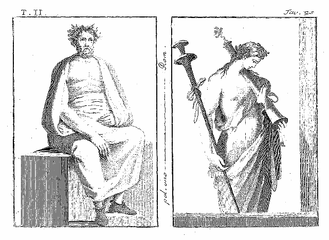 Le second personnage couronné de lierre, vêtu d'un simple pallium, ayant des souliers qui couvrent entièrement le pied, et qui, sans cette couronne, à sa barbe bouclée, à sa physionomie pensive, paraîtrait un philosophe, n'est probablement qu'un poète, auteur des drames ou des hymnes qui faisaient partie de la fête à laquelle ces figures paraissent faire allusion.