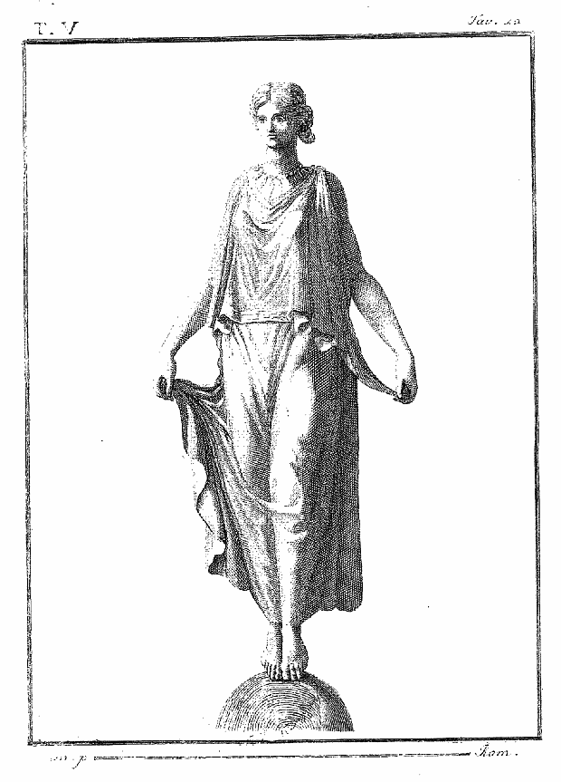 Ce bronze précieux par la beauté du travail et par sa rareté, représente une jeune femme qui, de la pointe de ses pieds réunis, se tient debout sur un globe. Cette seule indication toute particulière, semble suffire pour faire reconnaître la Fortune. Souvent on voit cette inconstante Déesse représentée avec une roue ou un globe auprès d'elle, et quelques fois sous le nom de Redux, avec le globe à la main. Nous ne connaissons point de monumens où elle soit posée sur le globe; mais cet emblème se retrouve dans d'anciennes traditions et d'anciens écrits. Dans le tableau de Cébès, la Fortune est ainsi décrite: «Quelle est cette femme qui paraît être comme une aveugle et une furieuse, et qui se tient debout sur une pierre ronde?—C'est la Fortune non-seulement aveugle, mais encore folle et sourde, et cet attribut dévoile bien sa nature.—Quel est-il cet attribut?—De rester debout sur une pierre ronde.—Eh! qu'est-ce que cela signifie?—Qu'aucun de ses dons n'est sincère ni stable, et que la chute sera profonde et cruelle à qui osera se fier à elle». C'est cette pierre ronde des anciens artistes que leurs successeurs ont remplacé par une roue. L'antiquité du symbole reproduit dans ce bronze, peut faire penser qu'il est d'ouvrage étrusque. L'union des jambes si agréablement motivée, s'accorde avec cette opinion, confirmée par le collier de gemmes et de rayons. Cette figure pourrait être la déesse Nortia des Toscans, reconnue communément pour être la même que la Fortune. Ses cheveux sont rassemblés sans recherche dans un nœud fixé derrière la tête; une tunique courte sans manches, soutenue sur les épaules par deux agraffes; une seconde tunique tombant sur les pieds, forment son vêtement souple et léger; d'une main elle tient avec grâce l'un des bouts de la première; de l'autre, elle soulève un pan de la seconde, et les plis cèdent, sur tout son corps, l'aspérité des formes de la jeunesse. C'est encore l'image de la Fortune Vierge, décrite par Varron, et revêtue de deux robes ondoyantes.