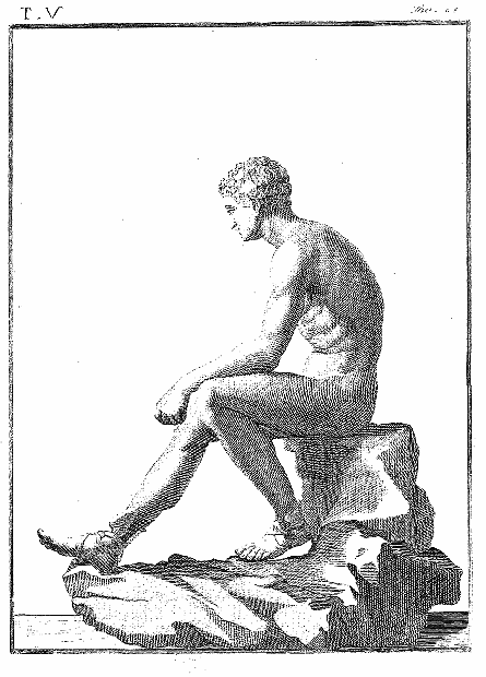 Voici la même statue de Mercure que nous offrons sur un autre point de vue. Les aîles au talon, se trouvant le seul attribut de la figure, auraient pu la faire prendre pour l'image de Persée, si de la comparaison des monumens, il ne résultait une opinion bien établie en faveur du messager des Dieux. On voit dans Béger (Thes. Brand, t. III, p. 236) une figure semblable assise sur un rocher, n'ayant pour tout attribut que les talonnières et une bourse à la main, qui ne peut convenir à Persée. Notre Mercure tient dans la main droite un fragment qui paraît appartenir au caducée ou à la verge avec laquelle le Dieu conduisait les ames aux enfers. L'état de repos ne paraît pas convenir à ce messager si bien employé; cependant ce choix d'attitude, quoique rare, n'est pas sans exemple; Pausanias (II, 3) fait mention d'une statue de bronze que possédaient les Corinthiens, représentant Mercure assis, ayant à ses côtés un bélier. Béger donne encore une très rare médaille de Tibère, où l'on voit au revers Mercure assis sur un promontoire; l'antiquaire observe qu'en Afrique, sur le promontoire de Mercure, était située la ville de Clupea, à laquelle appartient peut-être cette médaille. On élevait des temples sur les promontoires, et on y consacrait des statues de Mercure; on regardait, sans doute, ces lieux comme un point de repos pour le divin messager. Ainsi Virgile le peint se reposant sur le mont Atlas, et de-là se précipitant vers les flots comme un oiseau (Æn. IV, p. 252). Le poète l'appelle Cyllénius du mont Cyllène en Arcadie, où Mercure était né; ce lieu lui était cher, et peut encore servir à motiver la pose où il est ici représenté. Nous devons observer que le rocher est moderne; on n'a point trouvé la pierre ou le bronze antique qui servait d'appui à la figure; mais la restauration paraît suffisamment justifiée par toute l'attitude.