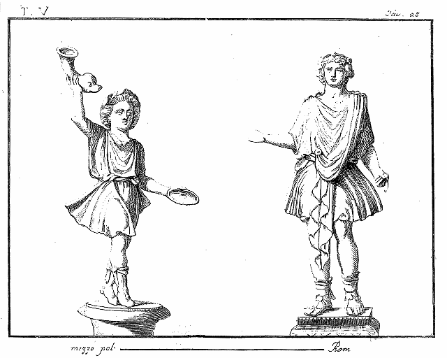FIG. I. Un jeune homme nu, le casque en tête, sans aucun autre ornement ni attribut. Les mains sont placées de sorte qu'elles paraissent avoir tenu quelque objet, peut-être une lance; la poitrine large et relevée est un signe de force. L'opinion la plus vraisemblable est que cette figure représente le dieu Mars. Nous l'avons déjà vu nu et imberbe dans une peinture (tome III, pl. 15). Nous avons aussi fait quelques remarques sur un casque ras assez semblable à celui-ci (Bronz. t. IV, pl. 43). Eschyle distingue Mars par ce seul nom, la Divinité au casque d'or. Il faut considérer ici le casque, seul attribut donné à ce bronze, comme celui du Dieu de la guerre. Parmi les différens surnoms donnés cette Divinité, on remarque celui d'Enyalius; sous ce nom, quelques Mythologues ont cru retrouver une autre Divinité; un fils du dieu Mars, adoré ou confondu avec celui-ci.