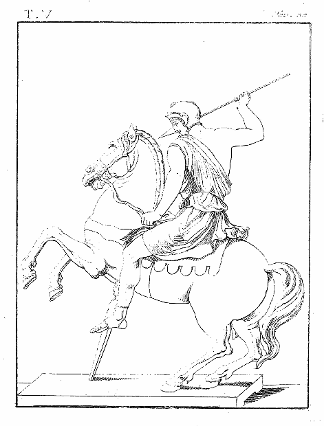 Cette figure curieuse servait à la décoration d'une fontaine, découverte dans les fouilles de Portici au mois de décembre 1754; elle tenait le milieu parmi dix autres plus petites, toutes servant au dégorgement des eaux. Le vieux Faune ou Silène, comme on voudra l'appeler, couronné de lierre, la barbe divisée en longues moustaches, est à cheval, d'un air très-sérieux, sur une outre qu'il tient par les oreilles, et dont la large bouche donnait passage à l'eau. Il se tient en bon écuyer, le corps droit et les jambes pendantes, approchant du ventre de sa monture, ses talons armés d'une chaussure grossière. Ces figures bachiques étaient souvent employées à répandre les eaux des fontaines. Le caprice de l'artiste en variait à son gré les intentions. Si l'on voulait supposer ici quelque intention allégorique, on pourrait rappeler le proverbe grec: «Le vin est un bon cheval pour qui a du chemin à faire»; mais il faudrait penser aussi que le bon Silène croit tenir entre les jambes une outre plus généreuse, et qui épanche autre chose que le trésor des nymphes.