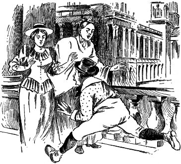 The old man drew his sleeve across his eyes and continued, "You see Mary's man was all broke down, and he told Sarah to take the children and he'd go wandering around the world for a year or two. Mary was the only child we had living, and when she died I wanted to move away from where she used to play [Pg 11] when she was a little girl, so in two years I got a good offer, and I sold out. All four of us went to see my sister in the city, and somehow didn't tell nobody where we were going, but I said I thought we would go on to California. Well, I found a stock farm in Illinois, and after a while we went back to our old home visiting, and the old neighbors told us a nice looking man had come soon after we left, and was nearly distracted to find us gone. He advertised and spent lots of money trying to find us, but at last went away broken-hearted. Then I sent Sarah right to Ohio, but Mary's man had sold his big clothing store, and some said he had gone to California, and others said one place and another, but he couldn't be found. He never came back to our old home place, nor to his old home place, for I've kept a writing ever since. Somehow he had to give us up. It broke me all down, and I've been doing all I could for the children. Fanny is getting a good education, for our town has got to be a big one now, and has a fine college in it; but I can't educate Johnny. He's always experimenting and doing damage. Howsumever, he's a great trader, and I'm going to give him a start some time. Why, I gave him a shote a month ago, and I don't believe there is a sled or a jack-knife in the hull neighborhood any more, for Johnny's got them in our garret, but the pig is gone.