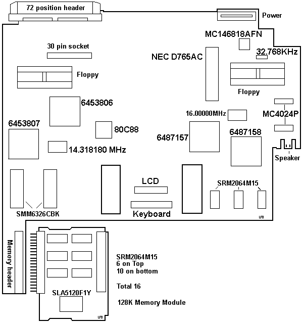 MC146818AFN RTC SMM6326CBK ROM 30 pin socket Modem Connector 6453806 Interrupt, KB, Audio, system clock, I/O controller 6453807 DMA Controller 6487157 Floppy, Printer, system timer 6487158 LCD Controller SRM2064M15 LCD Controller RAM DOS 3.2 or higher is required.