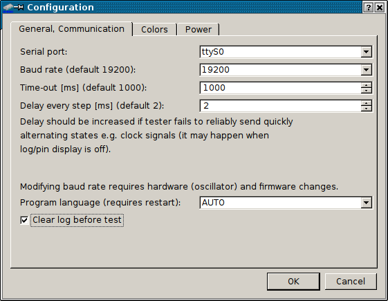 This tab is very important. As you've seen by looking at IC tester hardware, Tester's board has 4 DIP switches connected to power or ground, but it can support more with user settings. For example if you check many chips in 24-pin casings, and they need power connected to pin 24, you can use 5th DIP to connect power to pin 24. This window allows to define these additional switches and they're taken to account when suggesting you power configuration before test. Double-click on a selected DIP switch function to change what is connected to it: Power (Vcc) or ground (GND). There may be "empty" DIP switch too, it's just disconnected so it's only drawn as present, but not used. Then you have to specify socket's pin which is connected with this DIP switch. You can always revert to default setting by pressing Set defaults button.