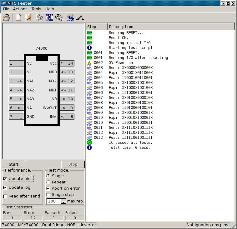 Then you must configure your tester according to drawing and after putting IC in socket hit OK to start the test. Any time you can display current sheet's power configuration by pressing Show Power Requirements button in toolbar.