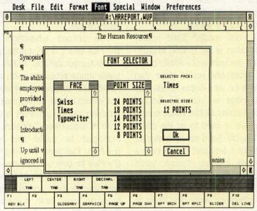 As mentioned earlier, you can select from multiple typefaces and point sizes in the document, and these will appear on the screen looking pretty much like they will when printed. You can also import three different formats of graphics: Neochrome, DEGAS (both compressed and uncompressed) and GEM (*.IMG) files. Once a graphic has been added, you can resize it, crop it and adjust the aspect ratio using the mouse or keyboard commands. A ruler runs across the top of the screen, making it easy to set and remove the four different kinds of tab stops (left, right, center and decimal) as well as set margins. The text automatically reformats as you type in new text.