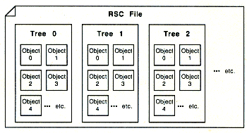 Before delving into the mysteries of the RCS, let's take a look at how resource files are organized. A resource consists of three different kinds of components, arranged in a hierarchical fashion as shown in Figure 1. First is the RSC file itself, which is the final product of using an RCS utility. Within that file there are one or more forms called trees. Each tree represents a separate dialog box. These trees are numbered consecutively, beginning with an index number of zero, in the order in which they were created with the RCS utility.