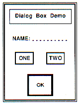 Within each tree are the individual components, known as objects, that make up the dialog box. Like trees, objects also carry an index number. For example, Figure 2 depicts a very simple dialog box that consists of seven objects: (0) the outlined outer box, (1) the smaller box around the title text, (2) the title text itself, (3) an editable text field, (4) a radio button, (5) another radio button and (6) an exit button.