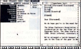 Superbase Professional's new built-in mail merge feature saves you the trouble of outputting records to ASCII format and then setting up your word processor's mail merge feature (if it has one) to use your Superbase data. You can type your letters directly into Superbase Professional's text editor or load them as ASCII files. The mail merge feature is very easy to use; you simply type in the names of the fields to use in the mailing, delimiting the fields with ampersands (&). Next, open the relevant text and database files and click on mail merge.