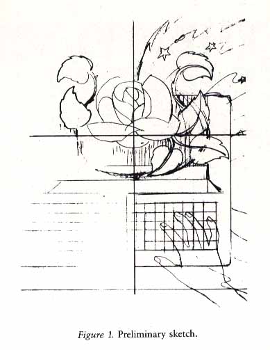 Our first step was to come up with a rough penciled sketch of the entire picture (see Figure 1). This was then enlarged, inked on acetate, and cut into four sections. Next, we taped the bottom-right quarter of the clear acetate drawing to our monitor's screen for quick layout reference (you can also draw directly on the glass with a washable marker).