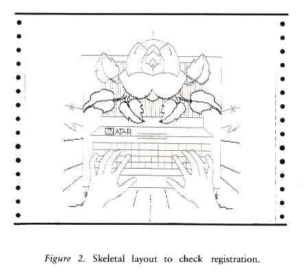 The opposite (top-right) section of the acetate drawing was handled in the same way. This gave us (after mirror-imaging or flopping the two original pictures) four separate full-screen pictures to print out and splice together. It's important to keep these drawings in outline or skeletal form, because it is difficult to get them to line up properly from top to bottom (see Figure 2). We found that we were usually a few cursor-dots off vertically, and this is something that needs to be checked for and corrected before you fill in the outlines with color.