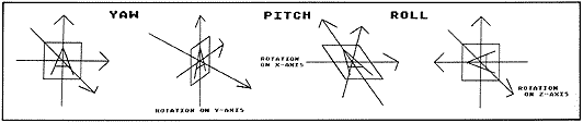 The program uses DATA statements to define the object that's shown in the illustrations of yaw, pitch, and roll. It's a square with the letter "A" and three arrows for the three axes, and the program will rotate it any way you'd like.