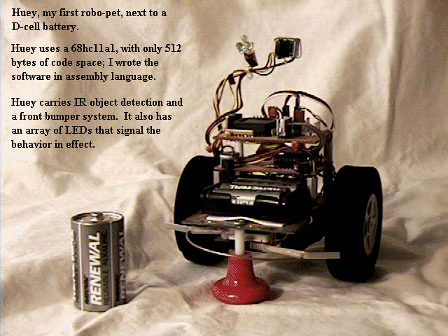 Huey (218K): A seven-inch tall robo-pet, also driven by modified R/C servo motors. Huey was my first robot, and is still a favorite at the school science fairs. I built a custom 68hc11 board for Huey, and wrote the code in assembly language. The entire program fits in the 512 bytes of EEPROM in a 68hc11a1. Huey has IR object detection, a front bumper switch, and blinking LEDs to show current behavior.