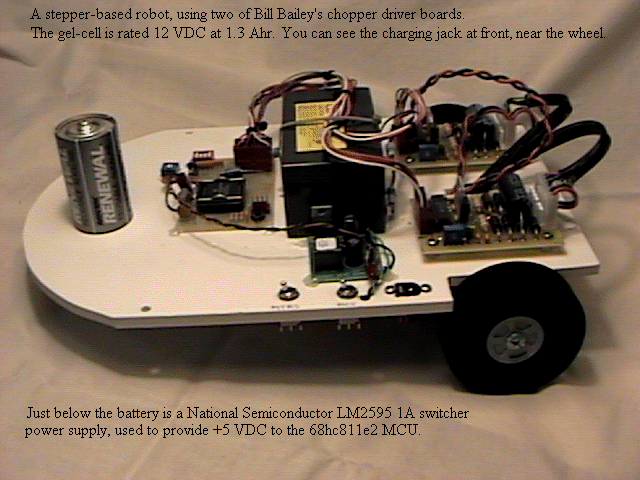 A stepper-based robot (200K):  A motor base, used for experimentation.  Overall length is about a foot. I used two of Bill Bailey's chopper driver boards to run the steppers.  The gel-cell is rated 12 VDC at 1.3 Ahr; you can see the charging jack near the front, next to the wheel.  I also used a National Semiconductor Simple-Switcher power supply, rated +5 VDC at 1 A, to provide power for the 68hc811e2 BOTBoard.