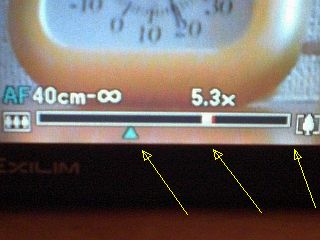 ズーム倍率については、「表示」が適当なので精確には分かりませんが、レンズの伸縮が停止する位置(水色三角印)を「光学ズーム」の「3倍」とみました。(左写真)