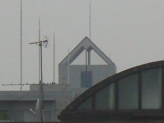ここまでアップすれば、TVアンテナがどの方向を向いているか?や、三角屋根の中には、釣鐘などは吊り下げられていなくて、只のガランドウだ!などが見て取れます。(つまり、似非(えせ)欧風、似非教会風の建築だってことでしょう)(笑)