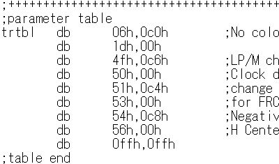 そこで、CRT表示時、STN表示時、TFT表示時での、各XRレジスタ値を比較して、替えなくても良さそうな"XRレジスタ値"群を、バッサリ削減した。