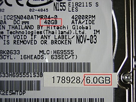 HDD表面シートの印刷は「40GB」ですが、上に「6.0GB」のラベルが貼り付けられています。