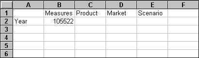When you retrieve data into an empty worksheet, Essbase returns data from the top levels of each database dimension. The top level is used as a starting point to navigate, or drill down, into levels of detailed data. In the Sample Basic database, the following five dimensions are retrieved: Measures, Product, Market, Scenario, and Year.