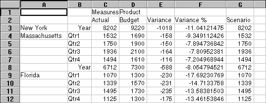 With Essbase, you can drill down to various levels of multidimensional data in the worksheet. For example, if you want to view data for a specific quarter or month rather than an aggregate data value for the whole year, you can drill down on the Year dimension to see more detailed data.