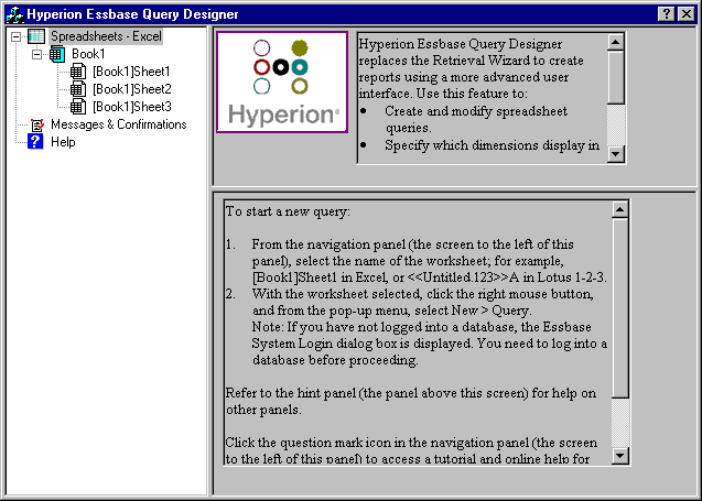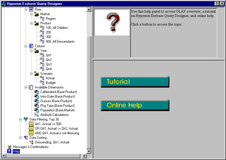 Access online help or the tutorial for Hyperion Essbase Query Designer by