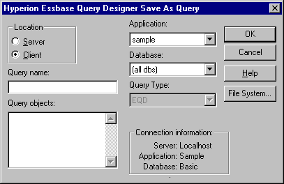 Essbase displays the Essbase Query Designer Save As Query dialog