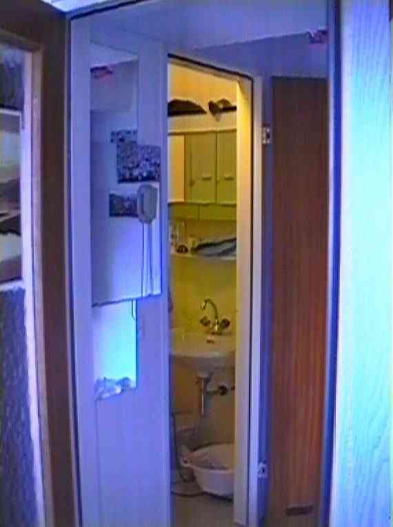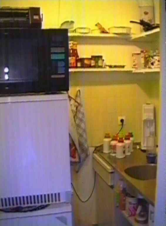 View into the (narrow) kitchen. Beyond the refrigerator, there's a washing machine also ;-) |