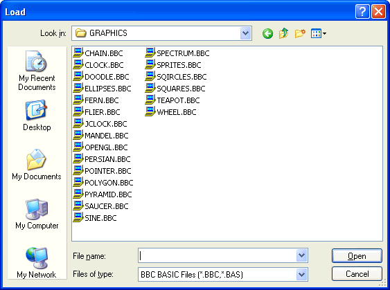 If the previous program was not saved, you are first prompted to save it. If a BASIC program is currently running (i.e. its output window is open) the Load command is inhibited.